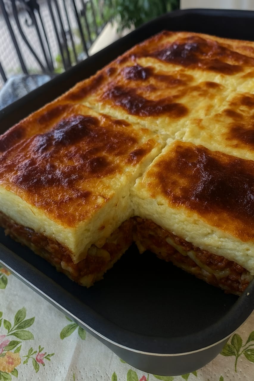 που αγκαλιάζει μια ζουμερή στρώση κιμά και ζυμαρικών. Είναι ένα φαγητό που συνδέεται με οικογενειακά