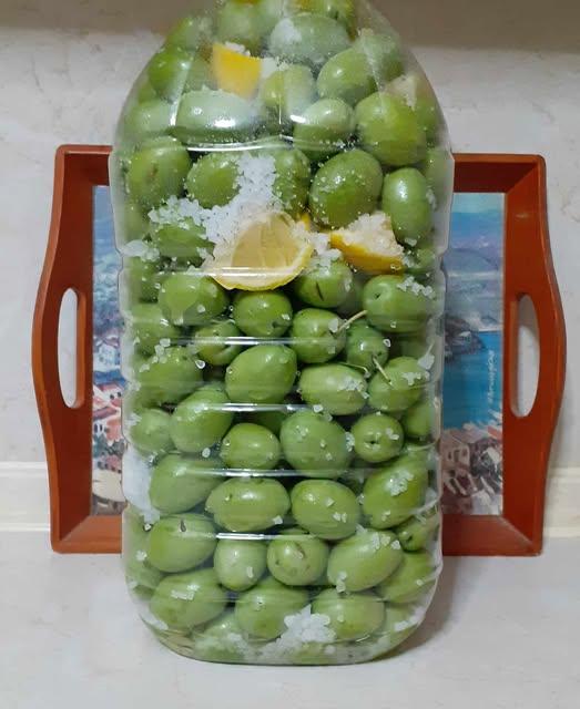 - Βάζουμε τις ελιές σε μπουκάλι, προσθέτουμε 3 κουταλιές χοντρό αλάτι και κουνάμε καλά για να ανακατευτεί το αλάτι με τις ελιές. Αφήνουμε 24 ώρες.