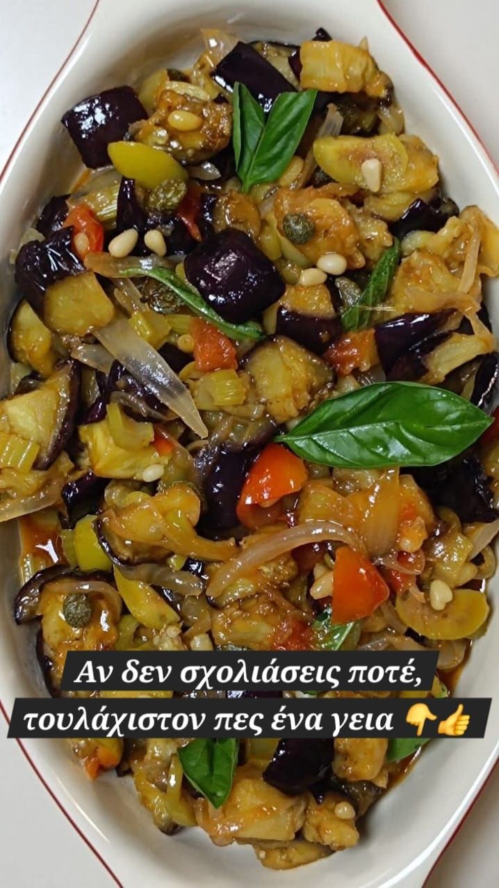 Μια νόστιμη και πολύχρωμη σαλάτα με μελιτζάνες, πιπεριές, κρεμμύδια και κουκουνάρια,